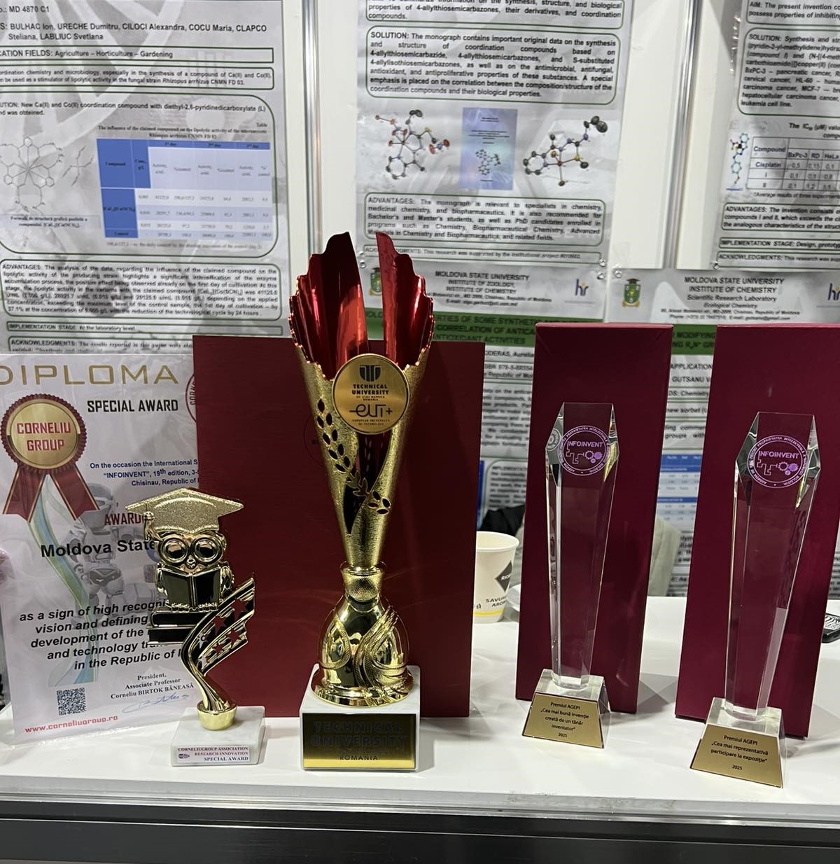 • TrofeulCea mai bună invenție creată de un tânăr inventator, oferit Alionei Pîntea, coautor al lucrării „Noi compuși coordinativi ai cuprului(II) cu activitate antiproliferativă asupra celulelor canceroase”. Distincția evidențiază contribuția tinerei cercetătoare la avansarea soluțiilor inovative în domeniul chimiei coordonative și al terapiei anticancer.