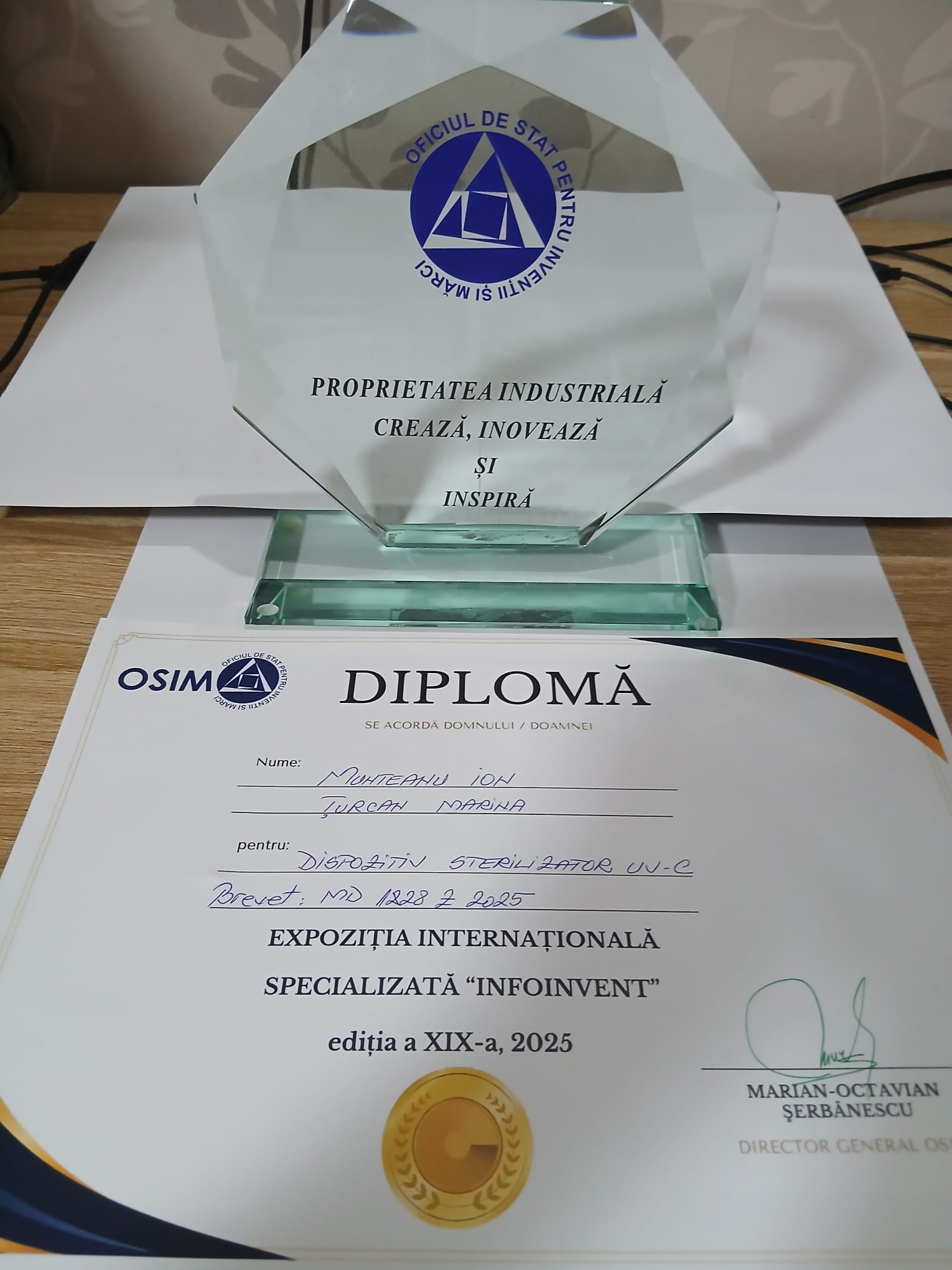 • Premiul Oficiului de Stat pentru Invenții și Mărci, București (OSIM) a fost acordat pentru lucrarea „ UV-C Sterilizing Device”, autori: Ion Munteanu și Marina Țurcanu pentru contribuții deosebite în promovarea proprietății intelectuale.